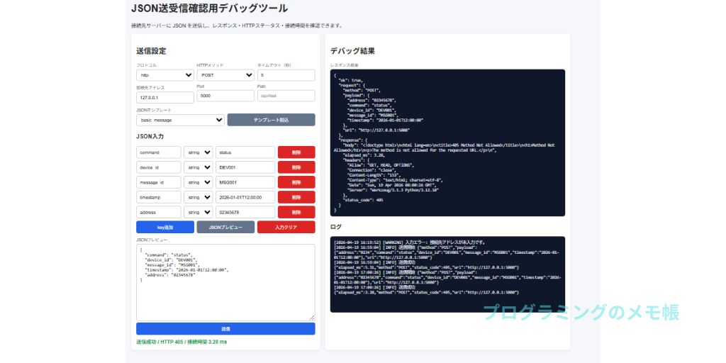 ブラウザからアクセスすると、送信設定とJSON入力画面が表示され、接続先サーバーに対してJSONを送信できます。送信後は、HTTPステータス、レスポンス本文、応答時間、ログをまとめて確認できます。
