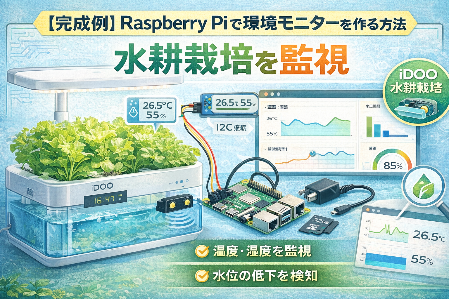 を使って、iDOO 水耕栽培キットを常時監視できる環境モニター を構築する完成例を紹介します。